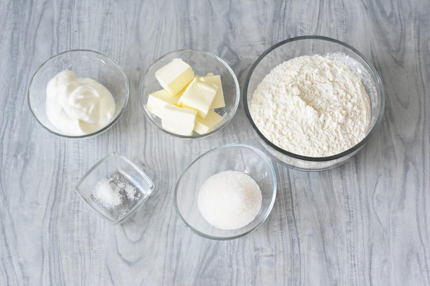Для начала подготовьте необходимые ингредиенты по списку. Приготовление начните с теста. Муку берите высшего сорта. Сливочное масло и сметана должны быть холодными, прямо из холодильника.