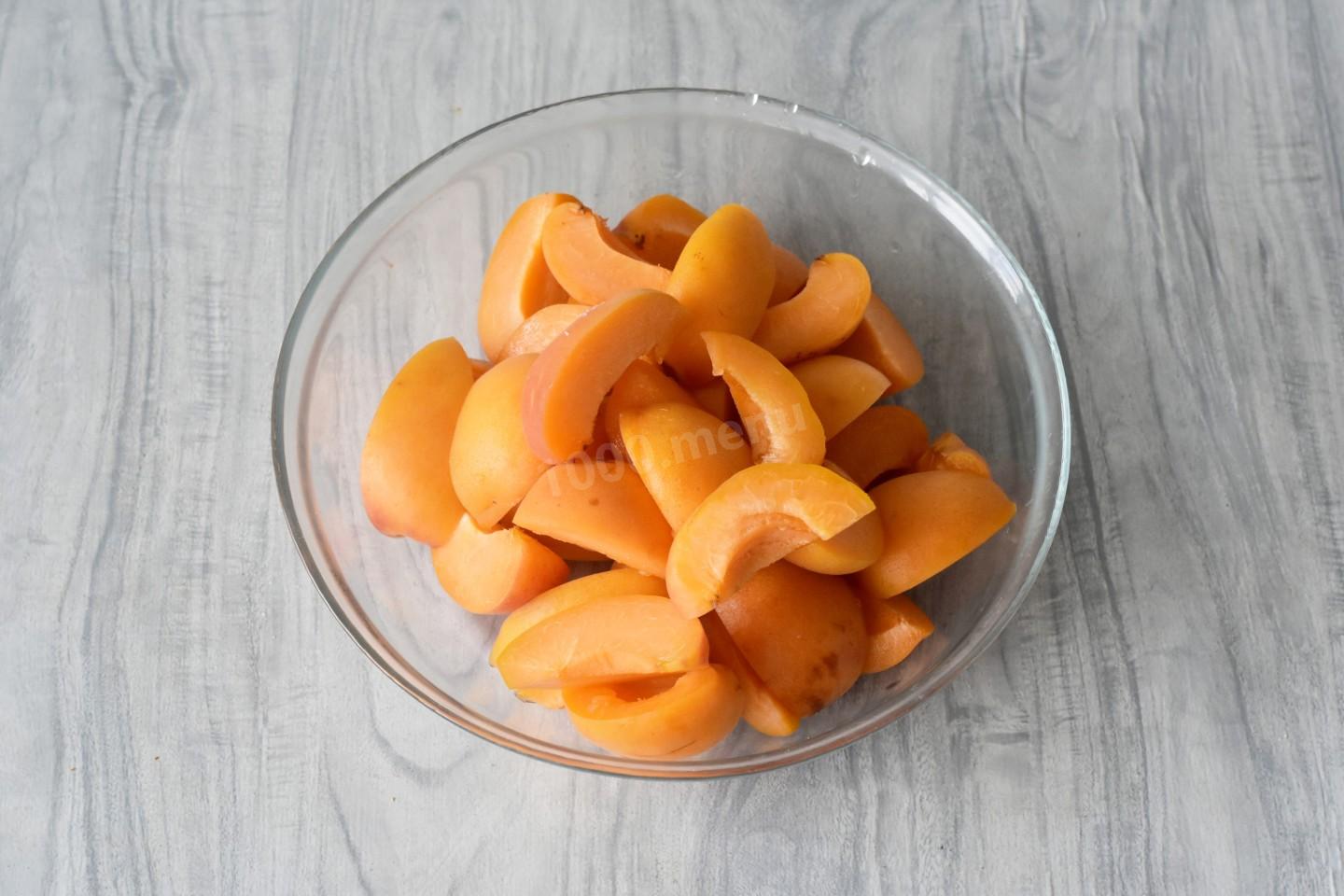 Абрикосы вымойте, обсушите. Разрежьте каждый пополам и удалите косточки. Если фрукты крупные, нарежьте их четвертинками. Чтобы абрикосы сохранили форму и не расползлись, выбирайте спелые, но плотные фрукты.