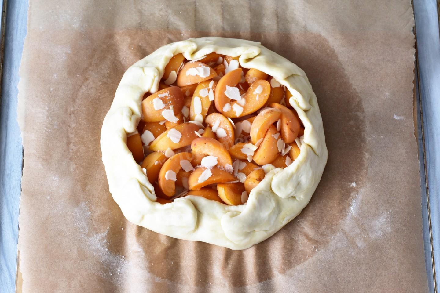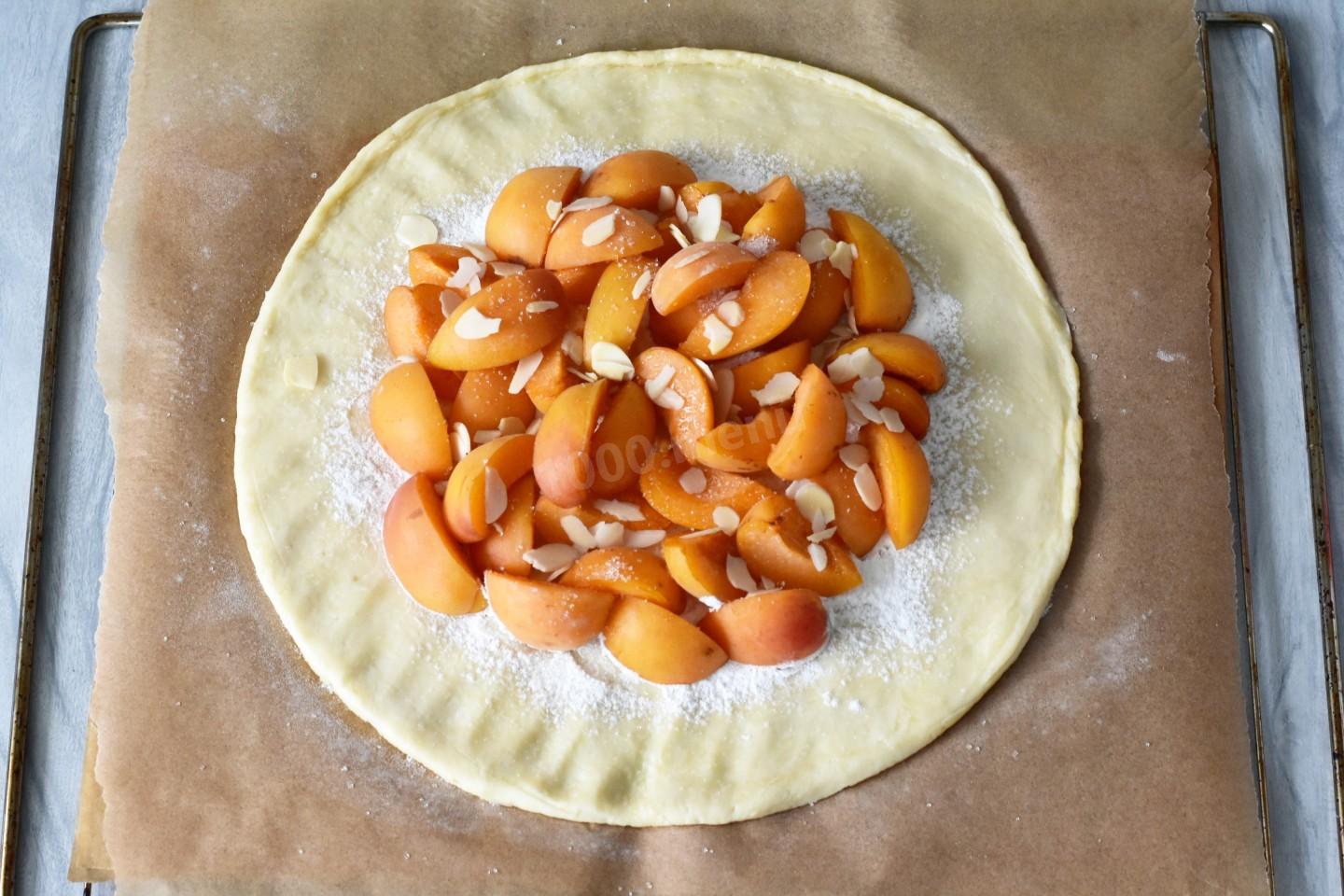 Тесто раскатайте на присыпанном мукой пергаменте в круг толщиной 4-5 мм. Тесто через ситечко присыпьте крахмалом, не доходя до краев 2-3 см. Перенесите пергамент с тестом на противень. На крахмал выложите абрикосы. Сверху посыпьте фрукты сахаром или смажьте медом. Сверху посыпьте миндальными лепестками.