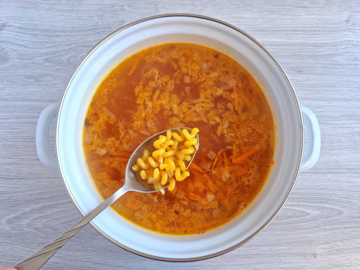 В зависимости от сорта и вида макарон будет зависеть время приготовления. Для обычных макарон это примерно 7-8 минут, а мелкие достаточно варить 1-2 минуты после закипания. Под шагами ниже из статьи можно узнать о сортах и видах макаронных изделий.Шаг 5. Когда добавлять зажарку в суп?