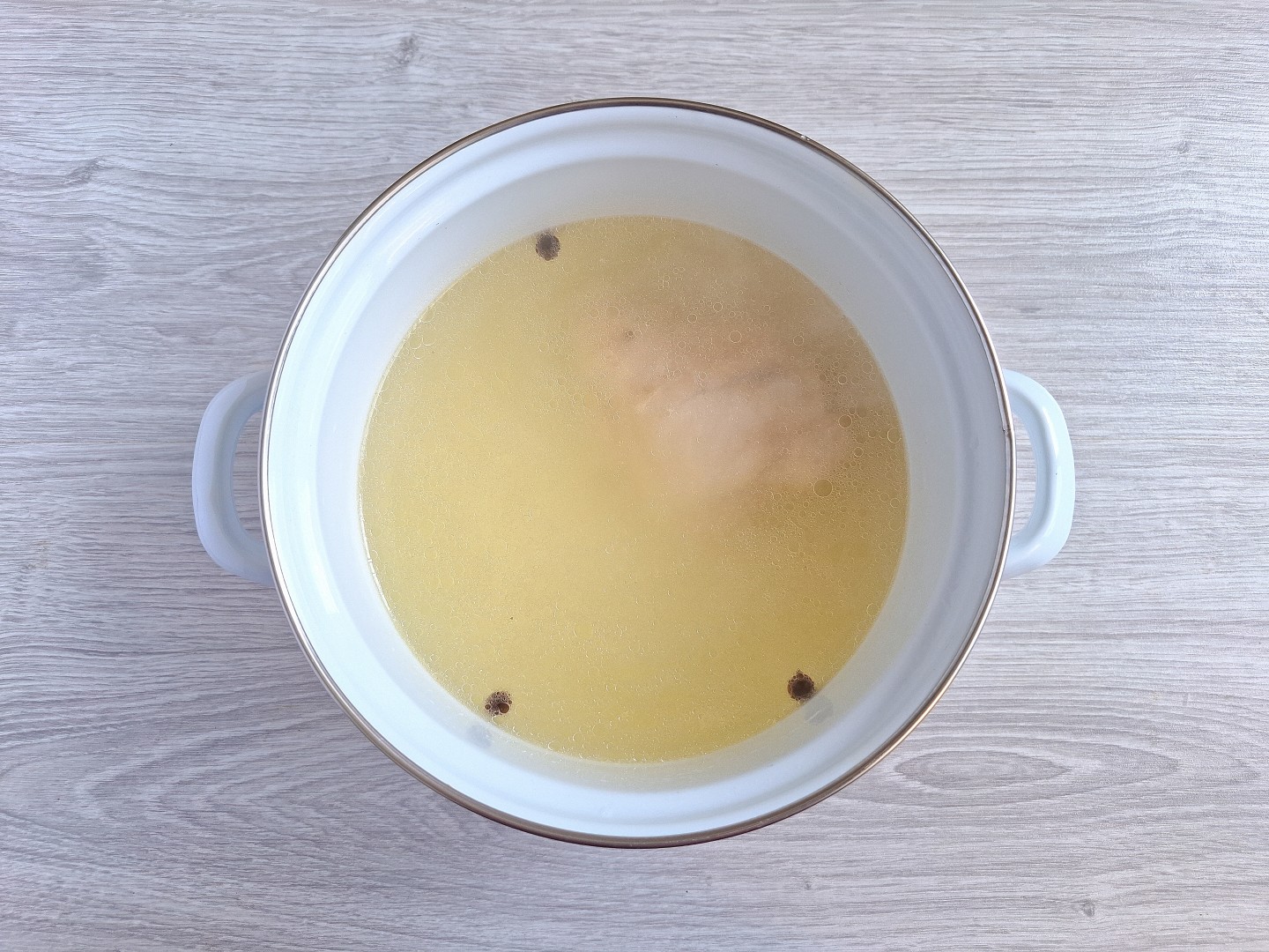 Курицу, если у вас большой кусок, порубите и сполосните. Положите курицу в кастрюлю, налейте воду и поставьте на средний огонь. Посолите, доведите до кипения и варите в течение около 25 минут, снимая пену. При необходимости бульон процедите, а у курицы убрать кости. С выбором кастрюли для супа поможет статья по ссылке в конце рецепта.Шаг 3. Как сделать зажарку?