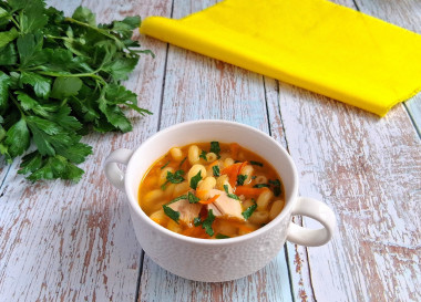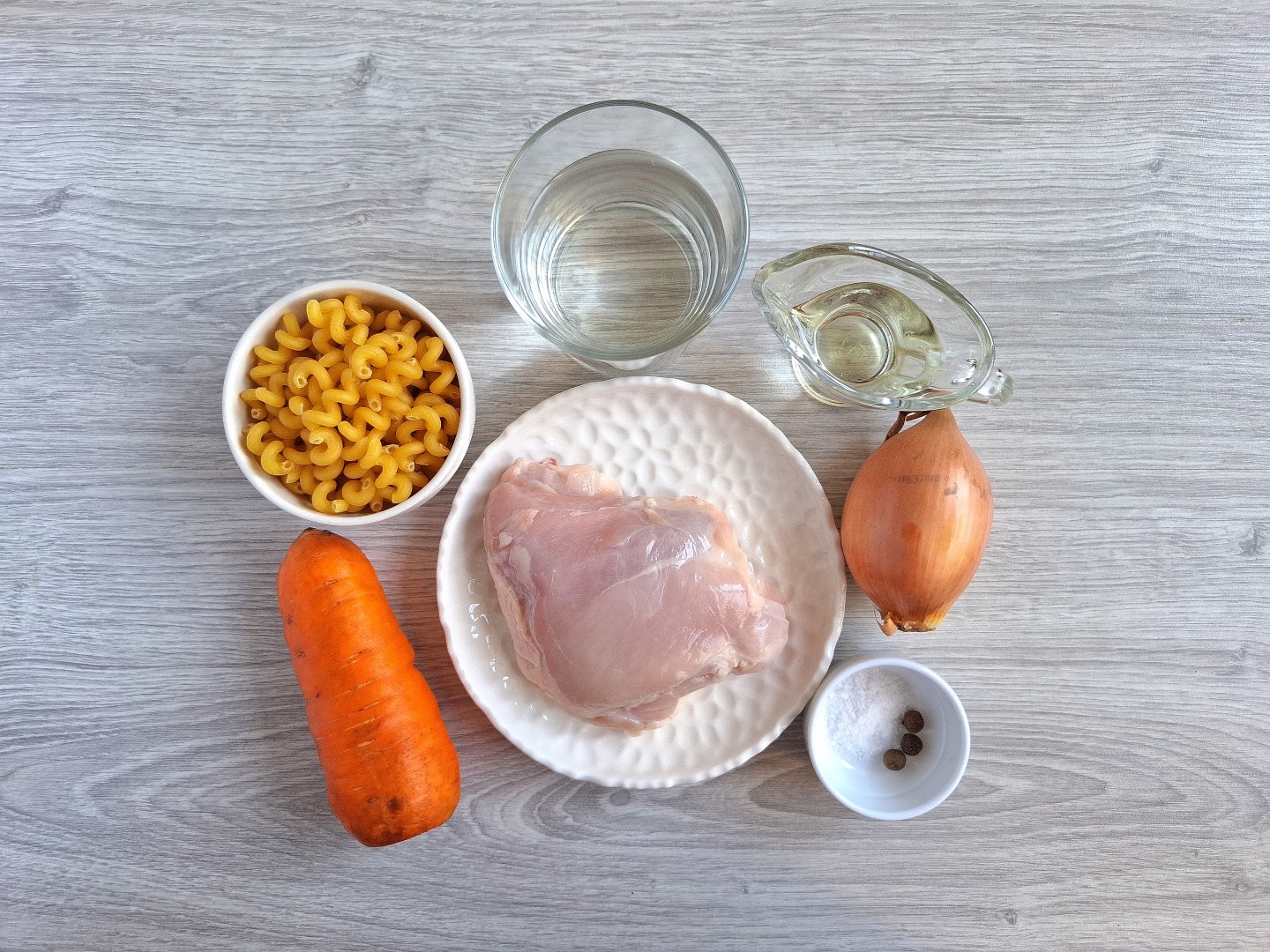 Куриный суп с макаронами сварила специально для дочки. Как раз по её запросу в этом блюде отсутствует картошка и присутствуют любимые макаронные изделия. Бульон варила из куриного бедра, с которого предварительно сняла кожицу для уменьшения калорийности. Для вкуса добавила душистый горошек. Затем мясо отделила от костей и нерезала кусочками. Бульон процедила сквозь мелкое сито. Лук и морковь слегка поджарила на растительном масле. Макароны у меня в виде витков, варятся они примерно 6-7 минут. Долго варить не нужно, в горячем супе они дойдут до готовности.