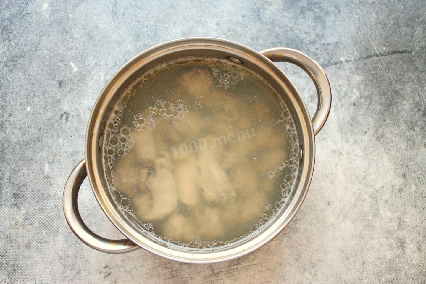 Курицу, если у вас большой кусок, порубите и сполосните. Положите курицу в кастрюлю, налейте воду и поставьте на средний огонь. Посолите, доведите до кипения и варите в течение около 25 минут, снимая пену. При необходимости бульон процедите, а у курицы убрать кости. С выбором кастрюли для супа поможет статья по ссылке в конце рецепта.