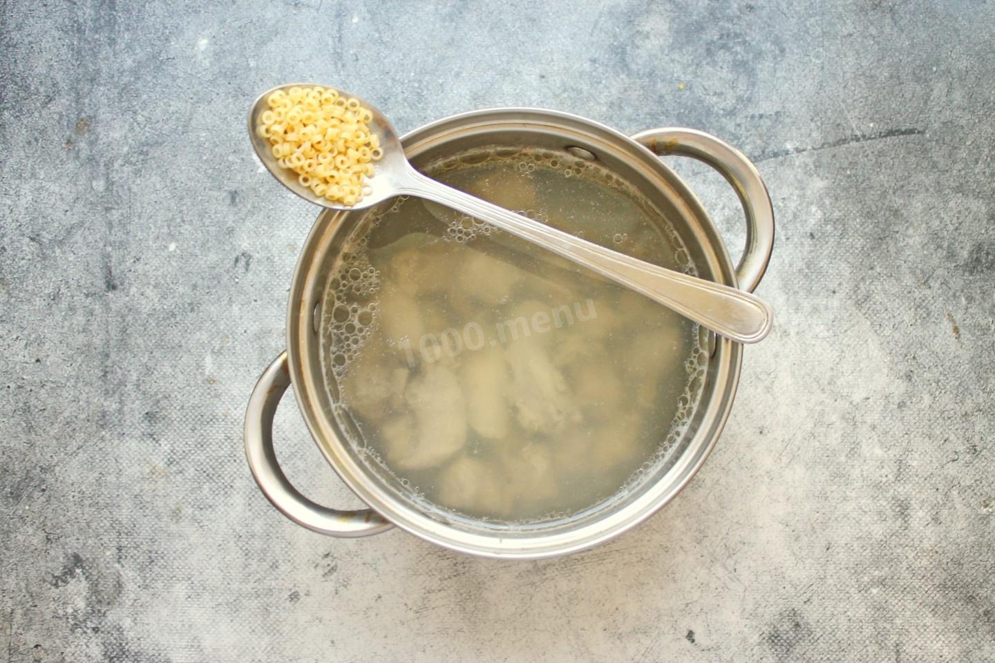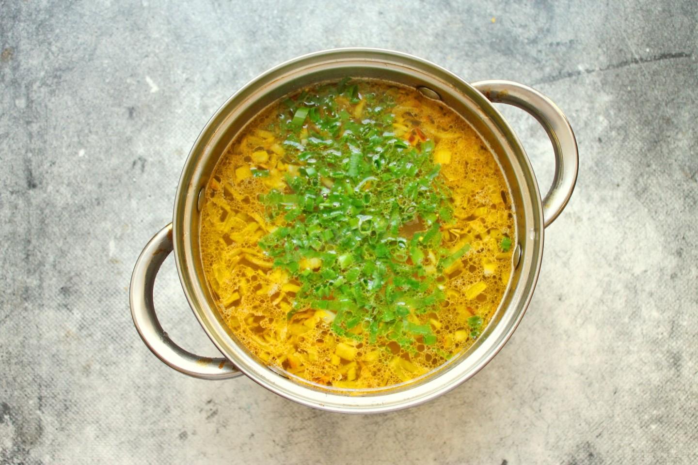 Когда будут готовы макароны, положите в суп зажарку, перемешайте и доведите до кипения. Снимите кастрюлю с куриным супом с огня и добавьте зеленый лук. Все поперчите, доведите до вкуса по вкусу, дайте постоять 3 минуты и подавайте на стол.