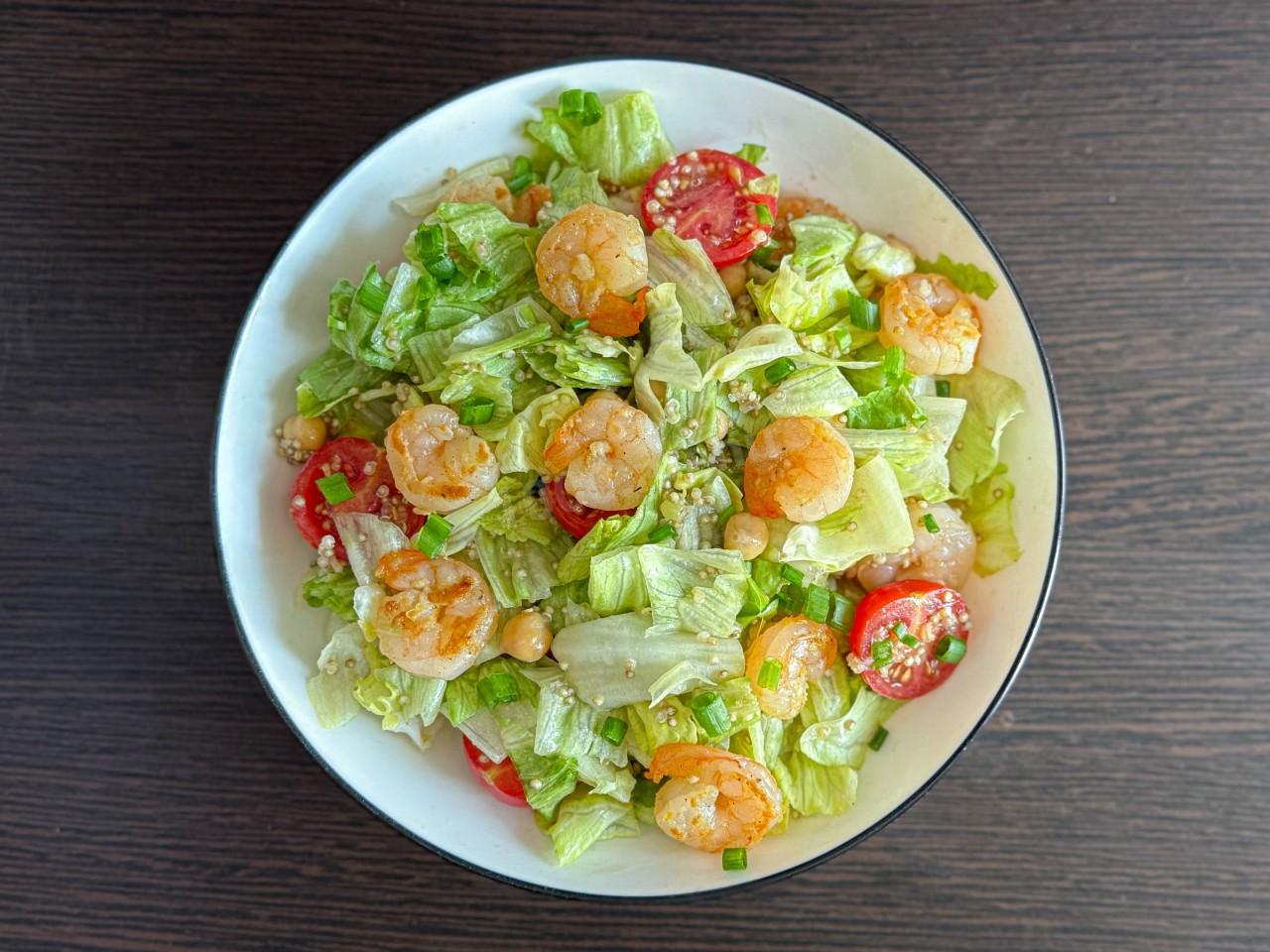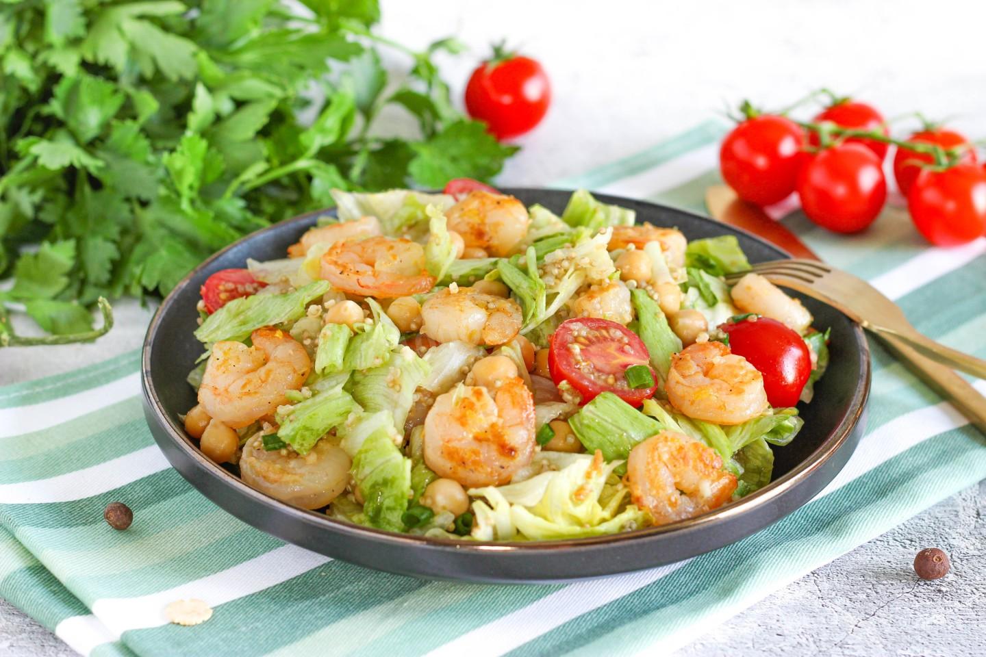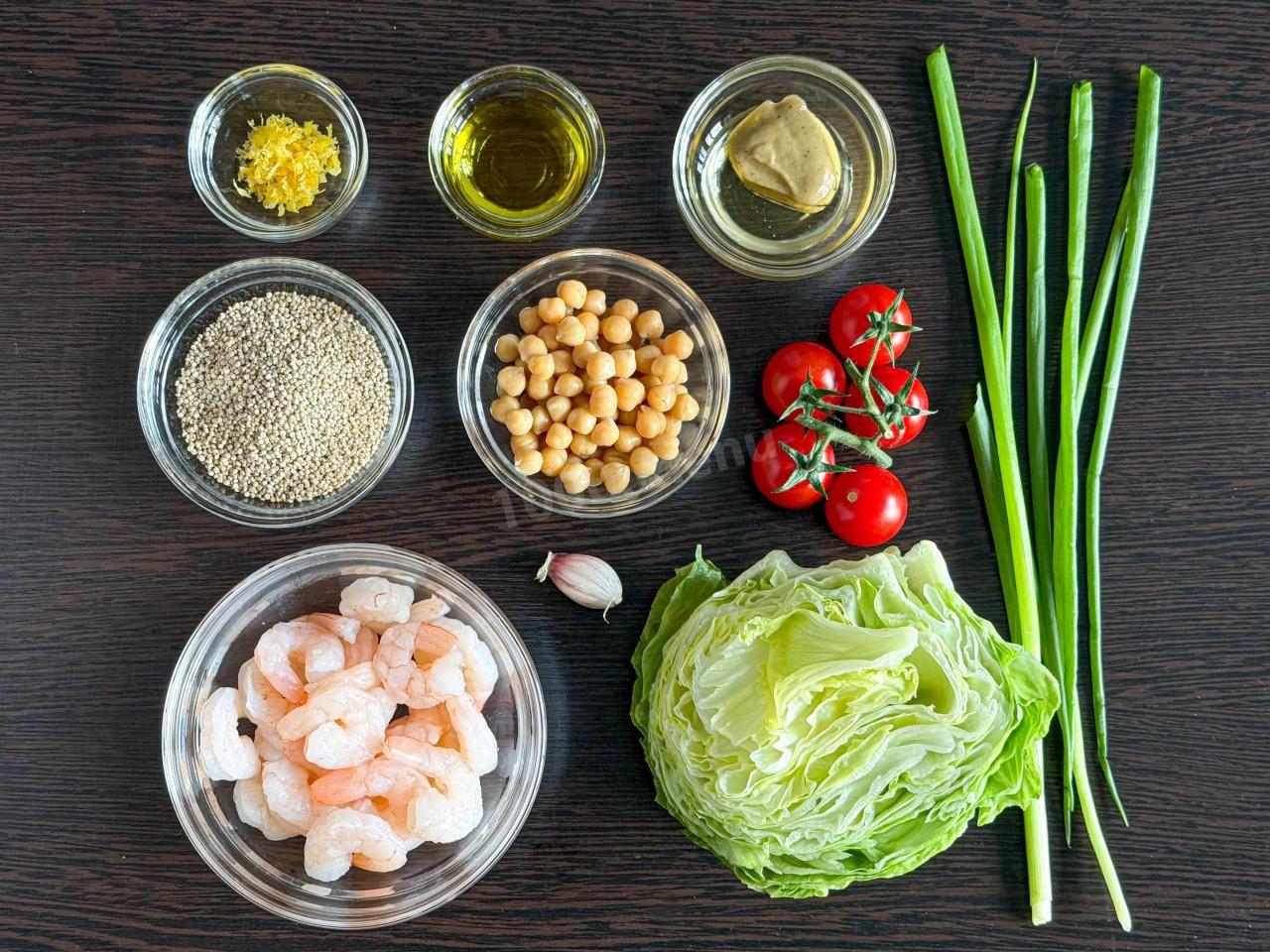 В глубокой тарелке смешайте листья салата, помидоры, креветки, нут, киноа и зеленый лук. Полейте заправкой и тщательно перемешайте.