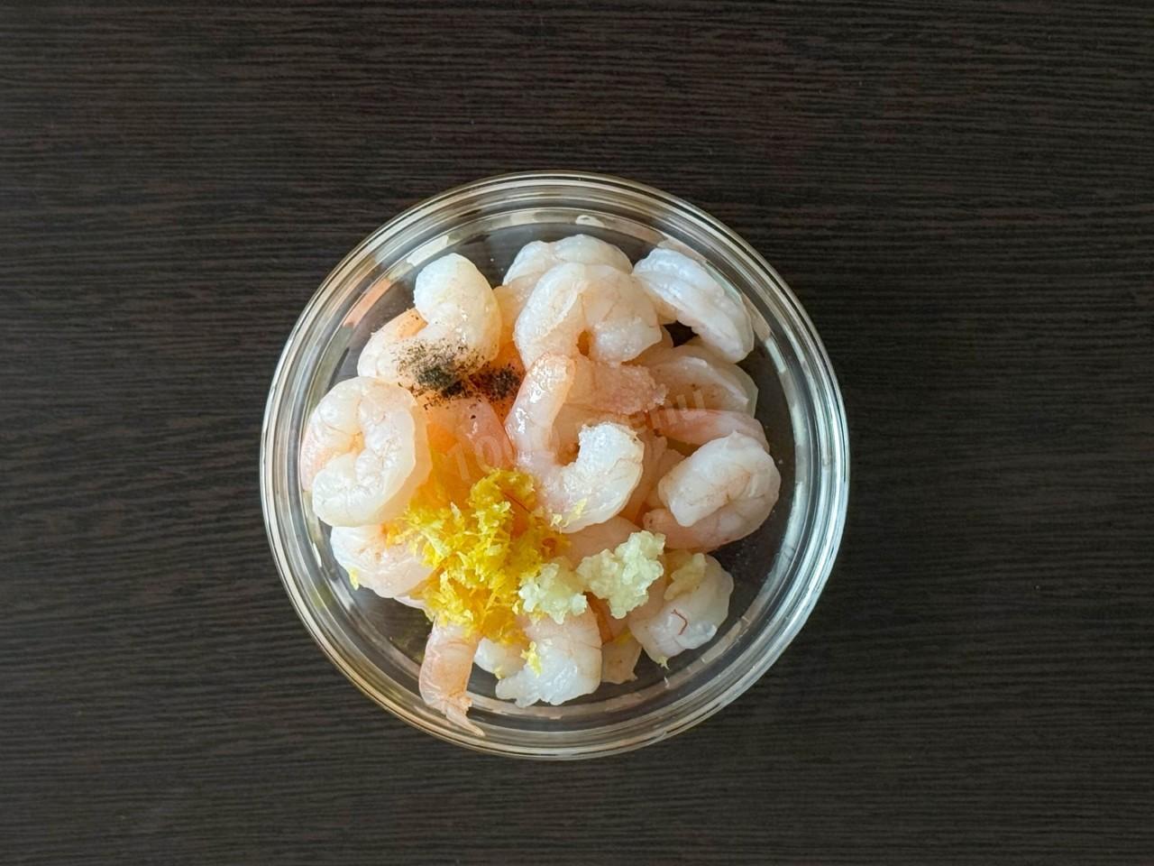 Креветки вы можете взять как сырые, так и варено-мороженные. О том, какие лучше выбрать креветки, а также о всех тонкостях их приготовления, читайте в статье под рецептом. Креветки разморозьте при комнатной температуре. Размороженные креветки очистите от панциря. К креветкам добавьте цедру лимона, оливковое масло, соль, перец и измельченный чеснок. Тщательно перемешайте.