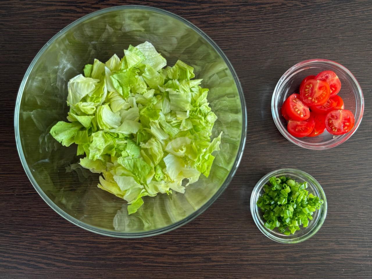 Листья салата, помидоры черри и зеленый лук помойте и немного обсушите. Помидоры разрежьте пополам, листья салата нарежьте средними кусочками, а зелёный лук — мелко.
