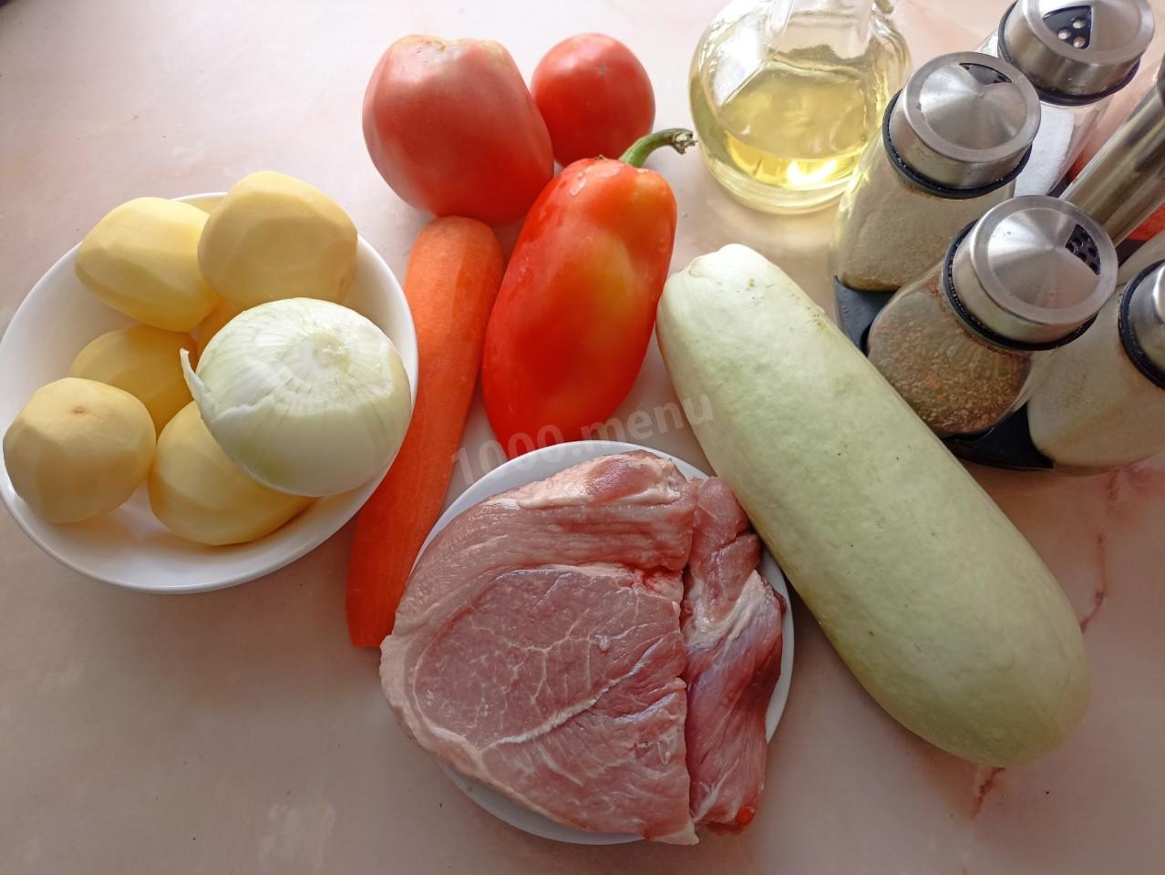 Подготовьте ингредиенты по списку. Овощи почистите, помойте. Лук, кабачок и перец нарежьте кубиком, морковь нарежьте кружочками, картофель и помидоры нарежьте крупным кубиком. Свинину можно заменить на курицу или индейку. Но учтите, что время приготовления и общая калорийность блюда могут измениться.