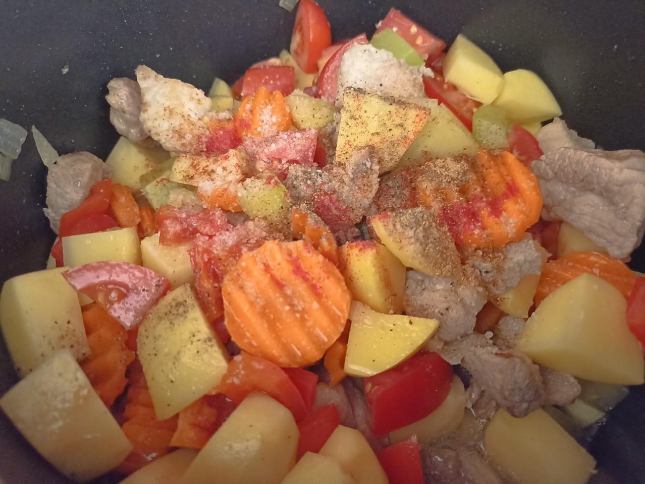 В чашу мультиварки налейте растительное масло, включите режим "жарка". Когда масло хорошо разогреется, добавьте нарезанную свинину, обжаривайте ее, помешивая, в течение 5 минут. Затем добавьте нарезанные лук и кабачки, перемешайте, обжарьте всё вместе ещё 5-7 минут. Морковь и перец также добавьте в чашу мультиварки, перемешайте и обжарьте всё вместе ещё 5 минут. Затем добавьте картофель и помидоры.