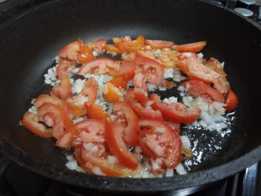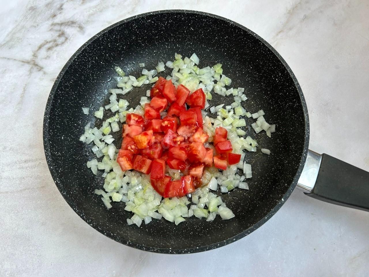 Нагрейте сковороду с небольшим количеством растительного масла. Обжарьте нарезанный лук до прозрачности и мягкости (примерно 3 минуты). Добавьте кусочки помидора и готовьте еще около 2 минут, пока помидоры слегка размягчатся. О том, как выбрать сковороду и идеальное для жарки масло читайте в отдельных статьях, ссылки под шагами.