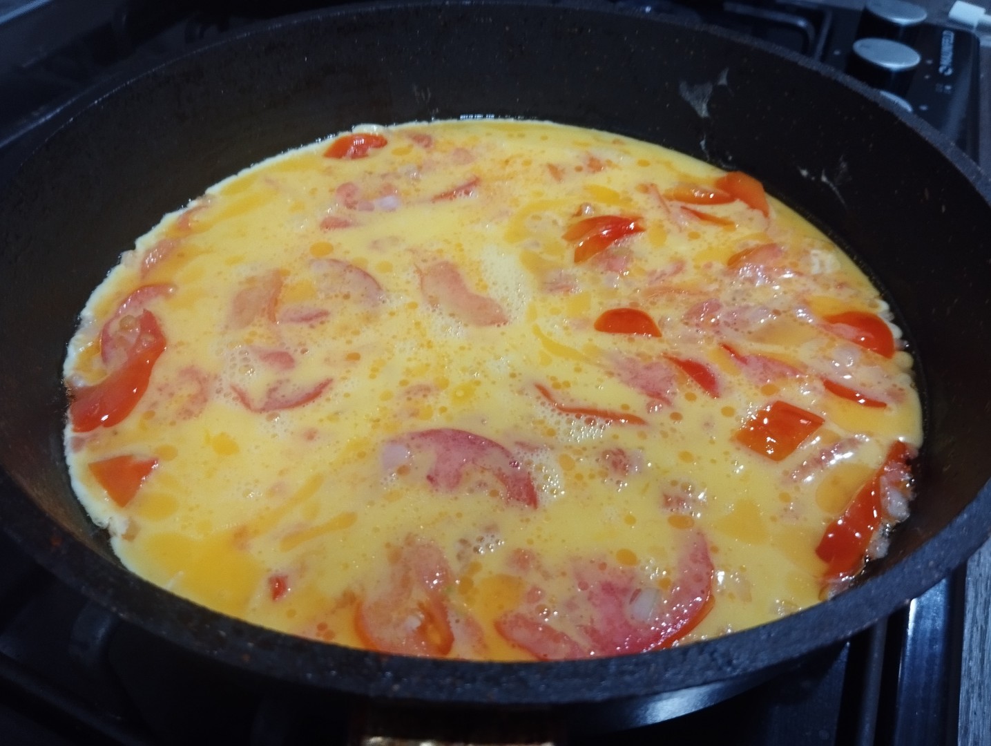Уменьшите огонь до среднего уровня и вылейте яичную смесь поверх обжаренных овощей. Готовьте омлет примерно 5–6 минут, периодически приподнимая края лопаточкой, чтобы жидкая масса стекала вниз и равномерно пропекалась.