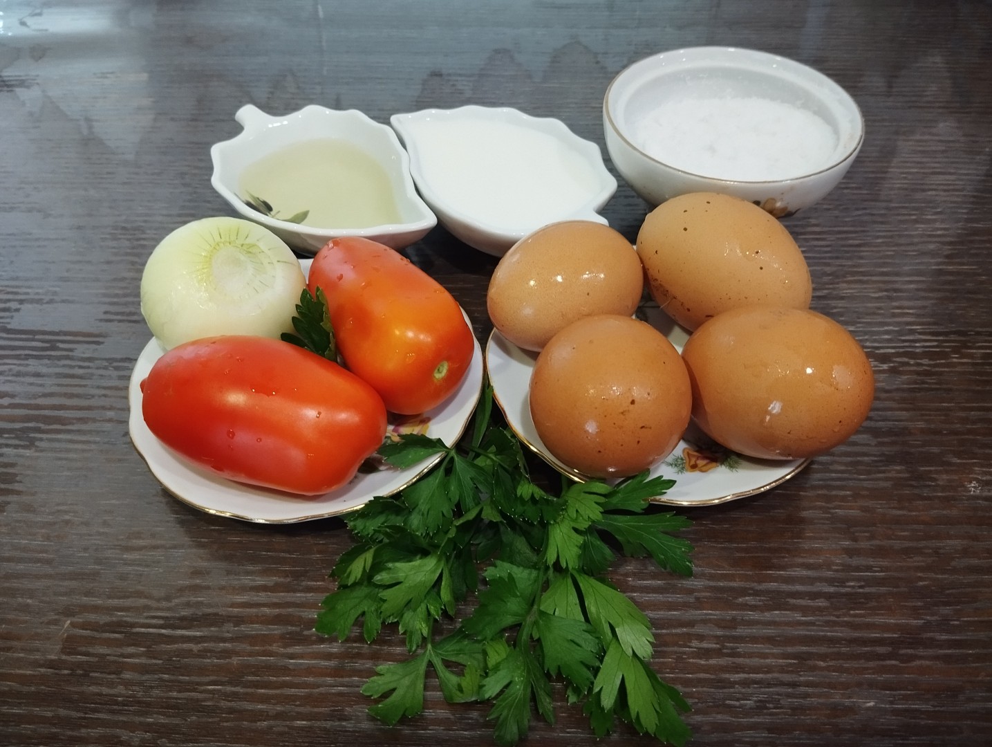 Лук порезала мелкими кубиками, помидоры дольками и обжарила. Яйца слегка взбила с молоком. Залила овощи и довела до готовности. Готовое блюдо посыпала измельченной зеленью петрушки.