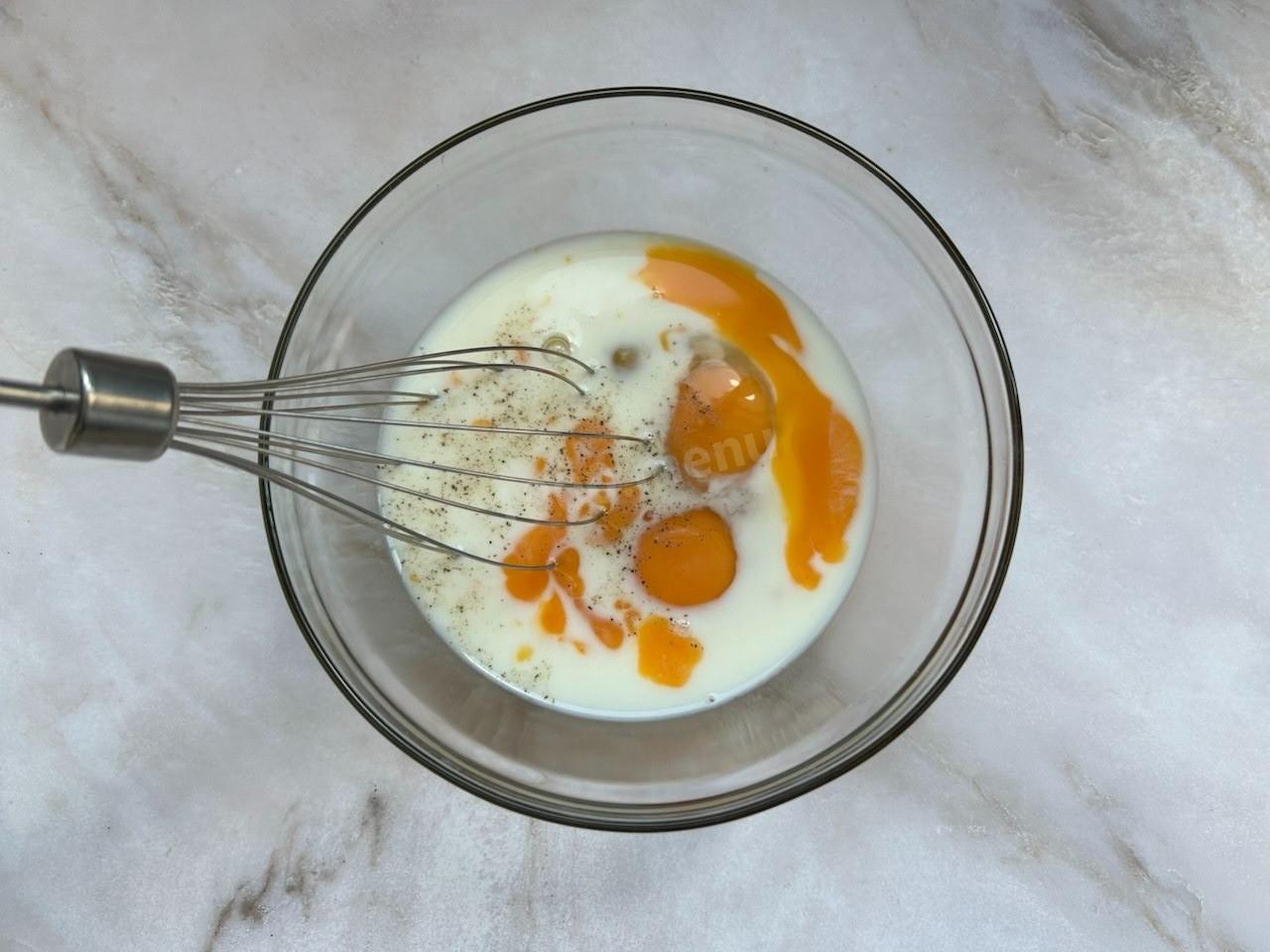Разбейте яйца в миску, добавьте молоко, соль и перец. Взбейте венчиком или вилкой до однородности.