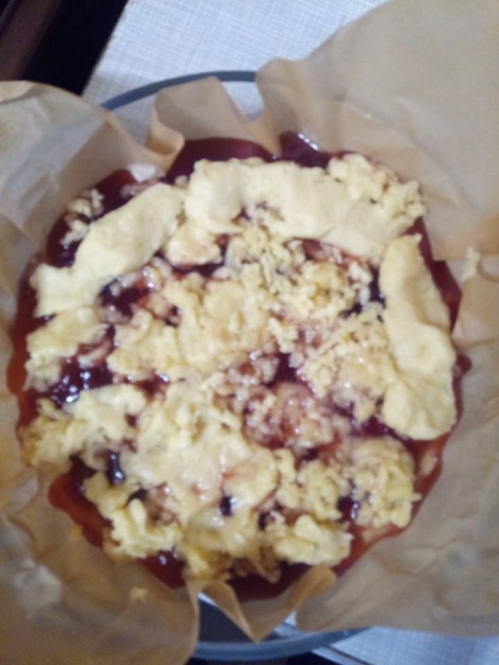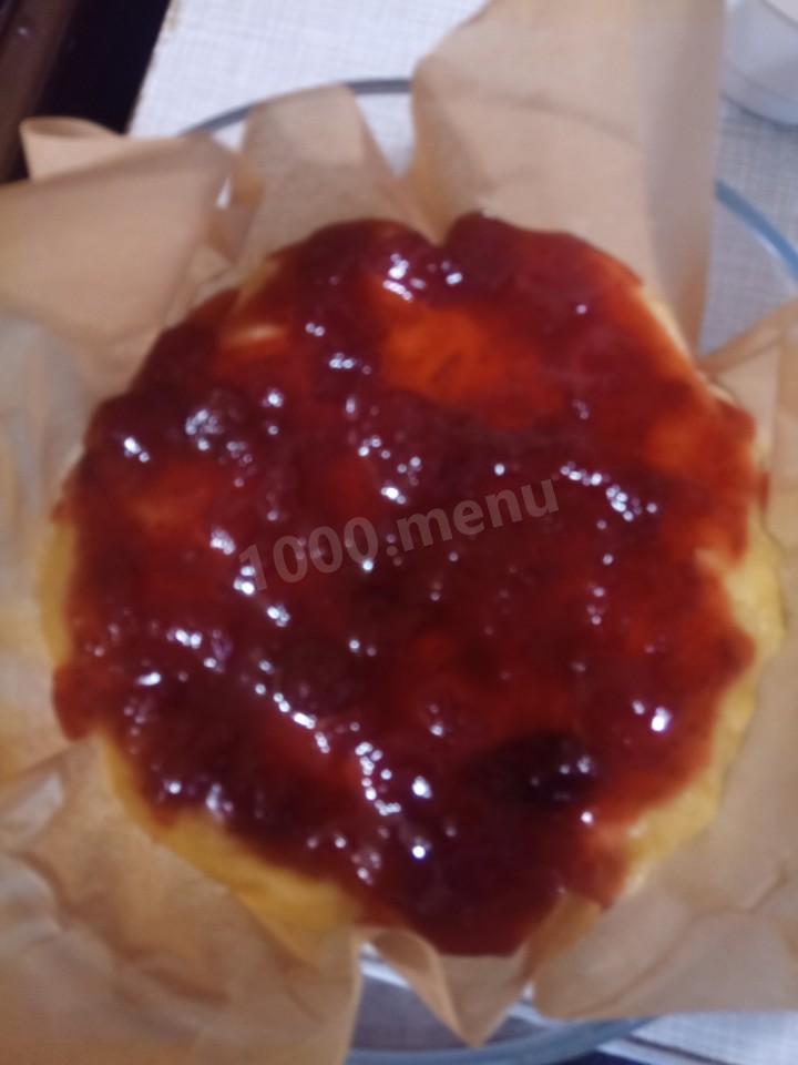 Форму покрываем бумагой для выпечки, выкладываем, равномерно распределяя туда оставшееся тесто, заливаем вареньем.
