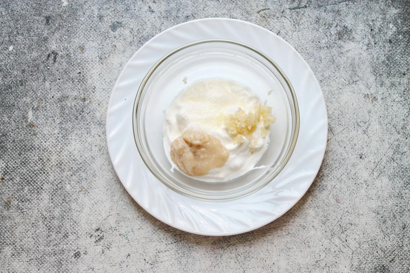 Смешайте сметану, готовый тертый хрен, измельченный чеснок. Доведите по вкусу на соль и при необходимости на сладость. Сметану можно заменить на натуральный йогурт без добавок.