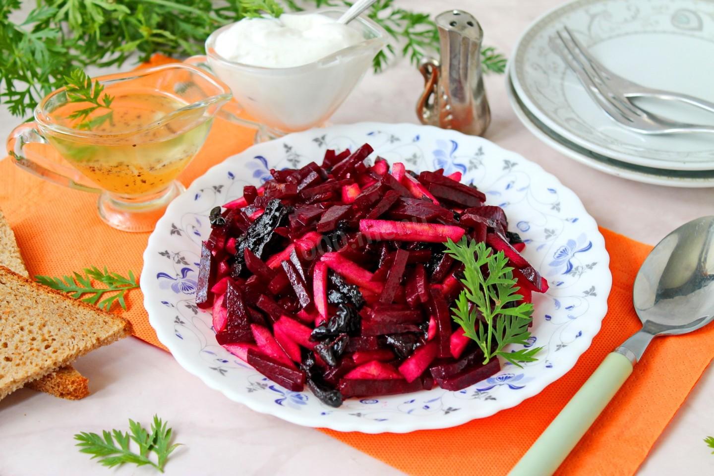 Свекольные салаты известны в русской и восточноевропейской кухне уже несколько столетий. Сочетание варёной свёклы с черносливом появилось как постный вариант праздничной закуски. Позже в рецепт добавили яблоки для свежести и кислинки, а также соусы — для разнообразия вкуса. Блюдо полюбилось за простоту и универсальность.