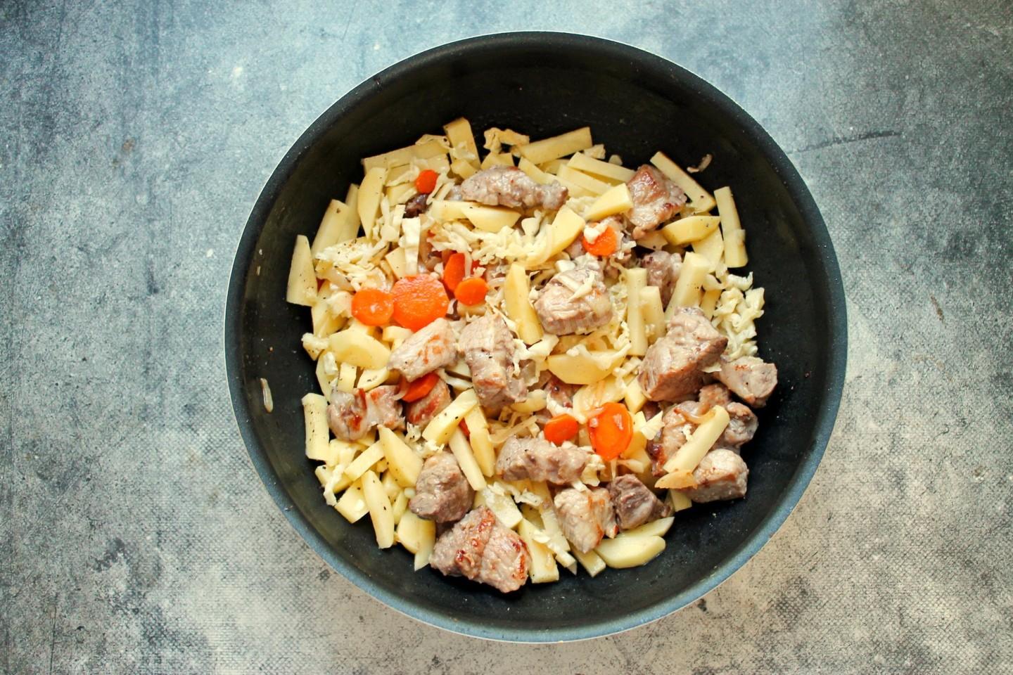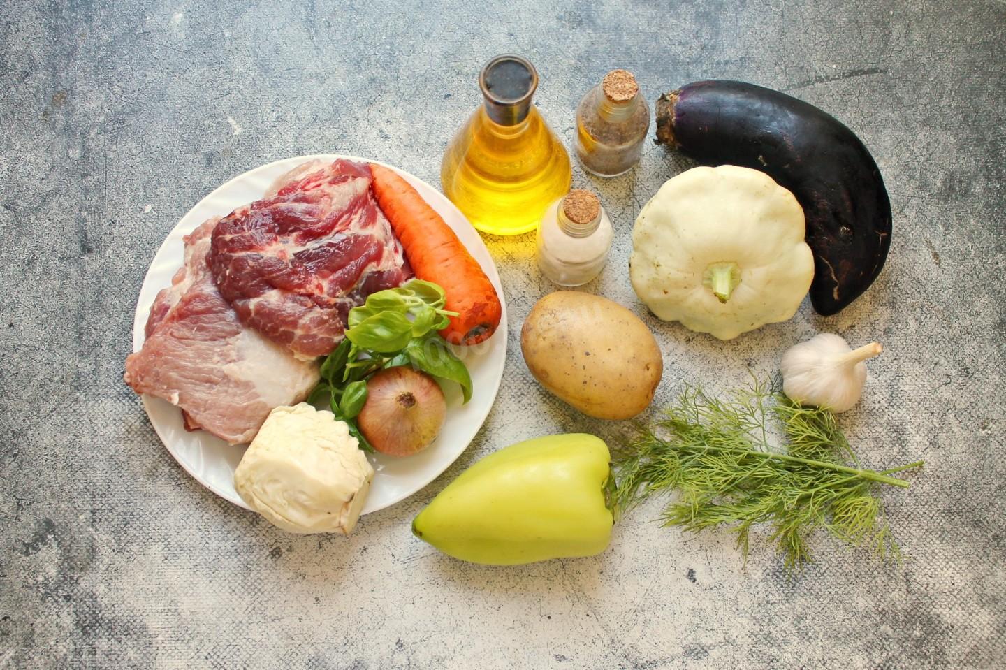 Подготовьте все необходимые ингредиенты для приготовления. У капусты снимите верхние листы, овощи при необходимости почистите и помойте. Свинину сполосните и обсушите бумажными полотенцами. Подготовьте овощи: репчатый лук порежьте полукольцами или четвертушками, морковь порежьте соломкой или колечками, капусту мелко нашинкуйте, картофель порежьте крупной соломкой, перец и патиссон нарежьте средними кусочками.