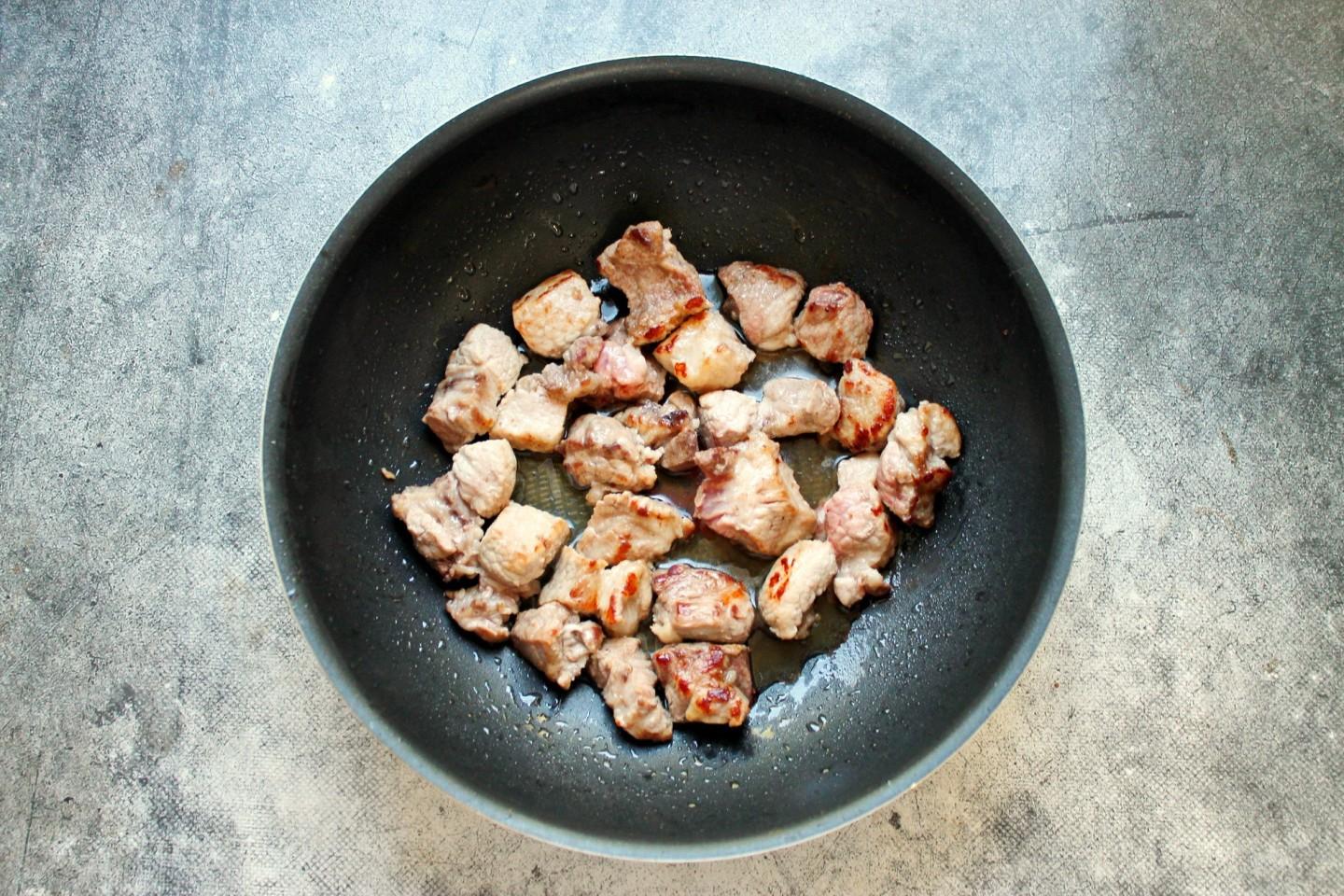 Свинину порежьте на средние кусочки. В казан или сковороду с толстым дном налейте растительное масло и разогрейте на сильном огне. Добавьте свинину и обжаривайте на сильном огне до румяной корочки со всех сторон. На это уйдет примерно 4-5 минут. О том, как выбрать идеальное масло для жарки и сковороде, читайте в отдельных статьях, ссылки под рецептом.