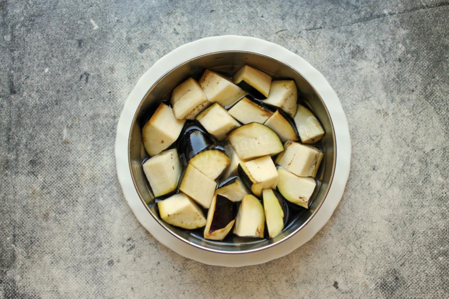 У баклажанов отрежьте кончики и порежьте крупным кубиком. Положите их в миску, хорошо посолите и залейте холодной водой. Дайте постоять 10 минут, откиньте на сито, сполосните и дайте воде полностью стечь.