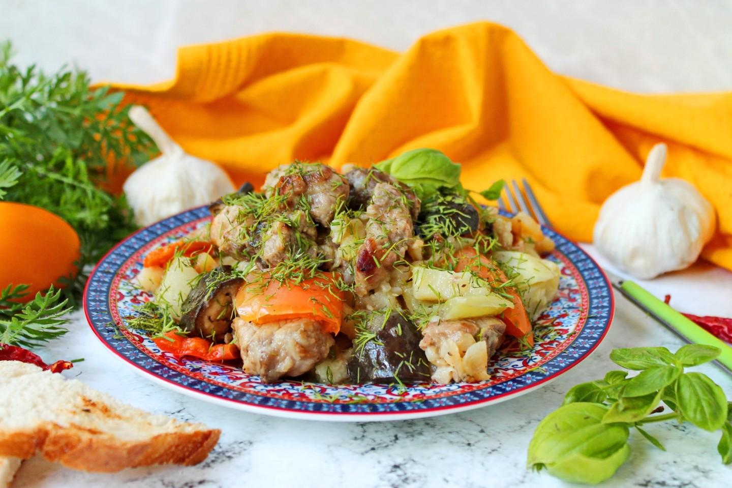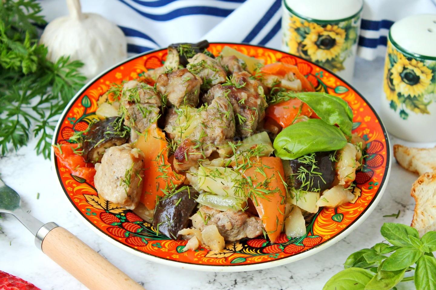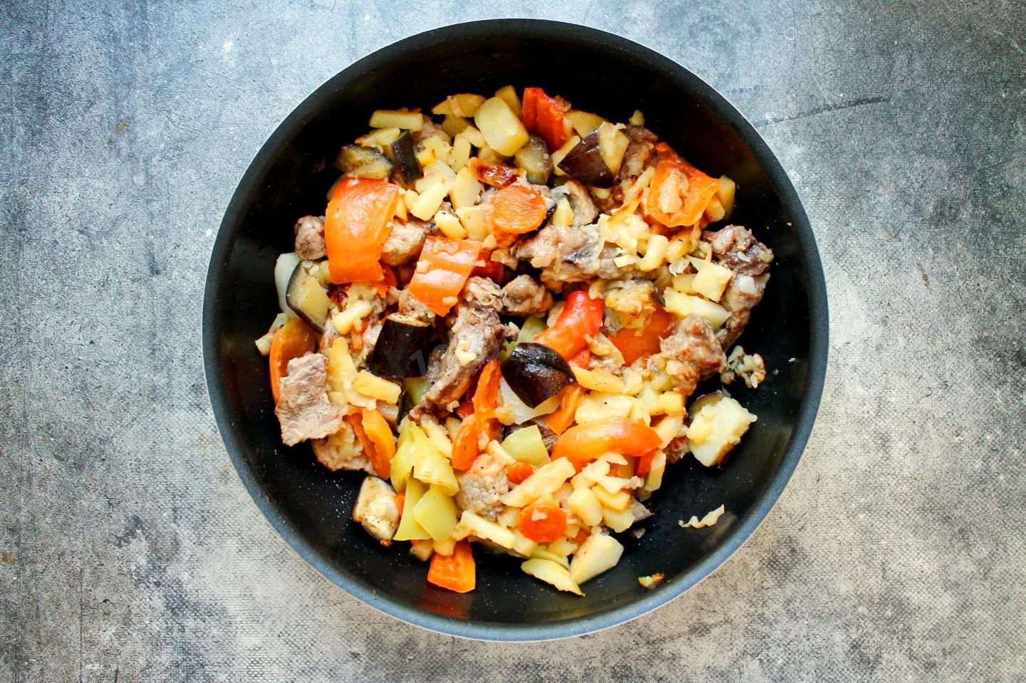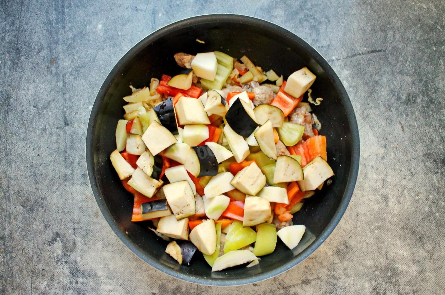 Репчатый лук и морковь добавьте к мясу. Все перемешайте и обжаривайте на среднем огне в течение 5 минут. Затем добавьте капусту и картофель. Все посолите, поперчите и перемешайте. Убавьте огонь, закройте крышкой и тушите все в течение 20 минут. Затем добавьте подготовленные баклажаны, патиссон и перец.