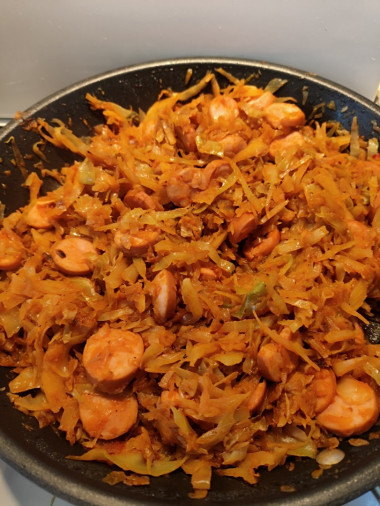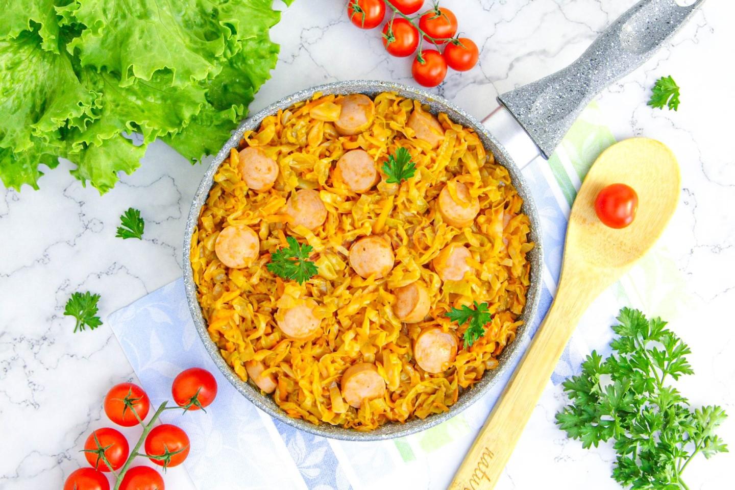 Блюда из тушёной капусты с мясными изделиями популярны в славянской и немецкой кухне. В советской классике это было простое блюдо из капусты и колбасы. Современные рецепты стали разнообразнее: добавляют специи, чеснок, томатную пасту. Получается недорогое и универсальное блюдо на каждый день.