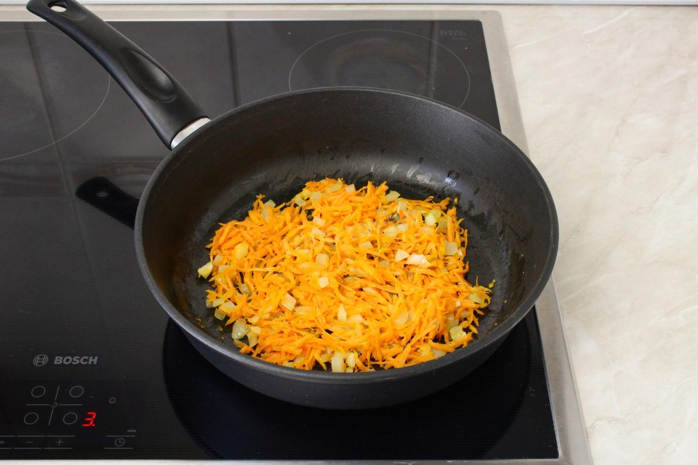 На сковороде разогрейте растительное масло, выложите подготовленные лук и морковь. Обжарьте овощи на умеренном огне, периодически помешивая, до полуготовности. Выбрать сковороду и масло для приготовления, а также определиться с температурой обжаривания помогут соответствующие статьи по ссылкам в конце рецепта.