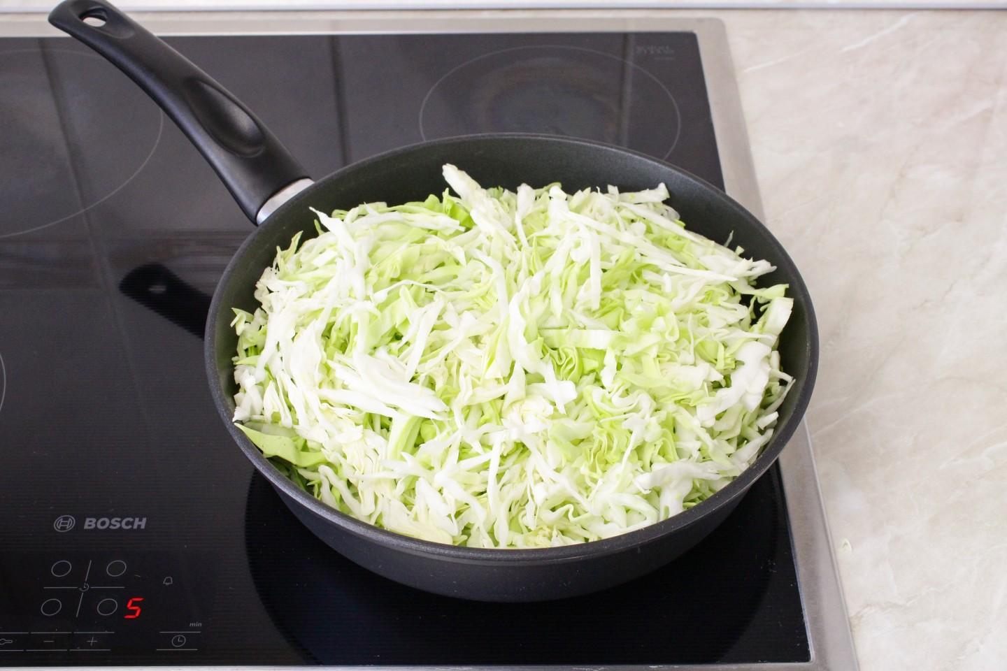 Добавьте в сковороду капусту. Если капуста не входит вся сразу, добавляйте ее частями по мере уменьшения ее объема в начале тушения. Перемешивайте капусту после каждого добавления. У меня была молодая, сочная капуста, поэтому я не накрывала сковороду крышкой, чтобы испарялась лишняя влага. Капуста тушилась в собственном соку. Если капуста менее сочная и не очень молодая, можно добавить во время тушения немного горячей воды и прикрыть сковороду крышкой.