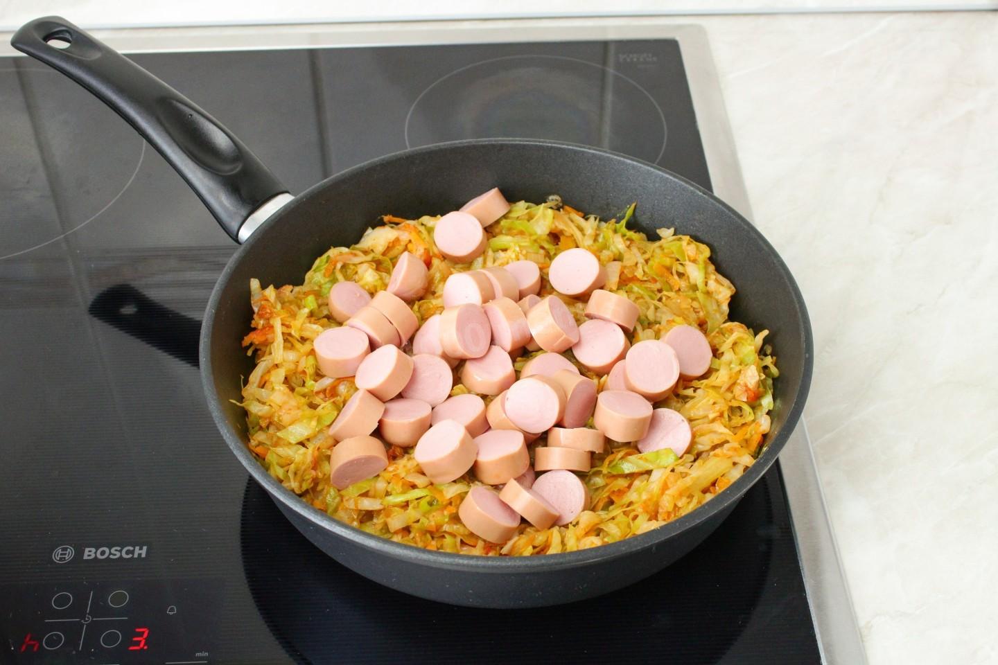 Шаг 5. Сколько тушить капусту с сосисками до готовности?
