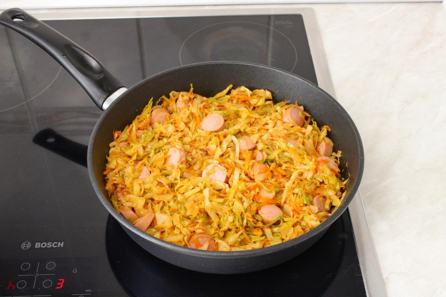 Готовьте капусту на медленном огне еще около 5 минут. Попробуйте блюдо, если необходимо, досолите. Прикройте сковороду крышкой и оставьте капусту на выключенной плите на 5-10 минут, чтобы сосиски и специи пропитали блюдо своим вкусом и ароматом.