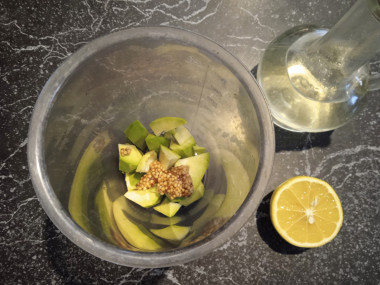 Тем временем выжимаем лимонный сок, чистим авокадо, режем их и взбиваем вместе с маслом, лимонным соком и горчицей блендером. По моим подсчетам - соус будет готов даже быстрее, чем мясо.
