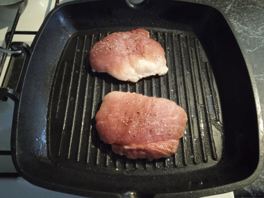 Обжариваем мясо (при такой толщине куска, как у меня, 2 минуты на сторону дадут вполне приличную прожаренность, но без пересушивания). На 1 сковороду такое количество мяса не вместится однозначно, если предполагается одновременная подача, то лучше жарить на двух - либо куски должны быть более толстые и компактные по площади) На последнем этапе солим мясо по вкусу.