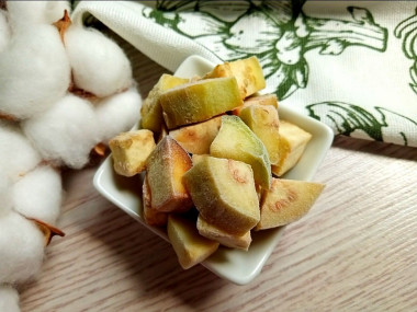 У меня было несколько баклажанов, но готовить из них было некогда. Поэтому нашла рецепт как заморозить баклажаны на зиму. Я и раньше морозила баклажаны, но они получались тёмными и на вкус мне совсем не нравились. Оказывается их нужно было залить кипятком и избавить от горечи! Это же так просто) Свои баклажанчики я очистила от шкурки, нарезала кубиком для будущего рагу и засыпала солью. Затем залила кипятком и подержала 30 минут. Чтобы избавиться от лишней воды, сначала выложила на дуршлаг, а затем на бумажное полотенце. Замораживала баклажаны россыпью на поддоне. Ночью морозила, а утром ссыпала в пакеты. Очень удобно получилось и кубики все один к одному. Уверена, что баклажаны в рагу будут очень вкусными!