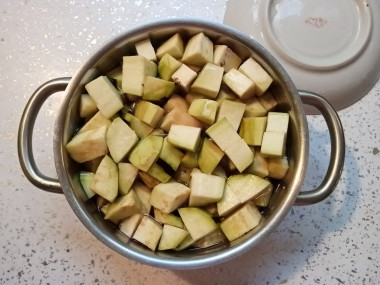 Чтобы баклажаны получились вкусными и не были «резиновыми», подвергнем их термической обработке. Для этого вскипятите чайник с водой и кипятком залейте кусочки баклажанов, сверху накройте их тарелкой, на которую установите гнет (у меня это миска с водой). Оставьте баклажаны под гнетом в течение 25 минут.