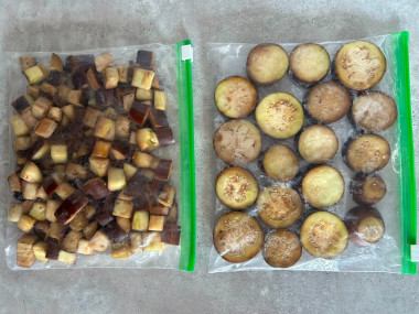 Пришло время заморозки овощей. Захотелось попробовать заморозить баклажаны на зиму по этому рецепту. Решила замораживать баклажаны кубиками и кружочками. Делала все по рецепту. Те что были кружочками сложила в зип пакеты в один слой, те которые кубиками сложила не толстым слоем и отправила в морозилку. Зимой буду наслаждаться вкусными баклажанами. Очень рада, что нашла такой рецепт!