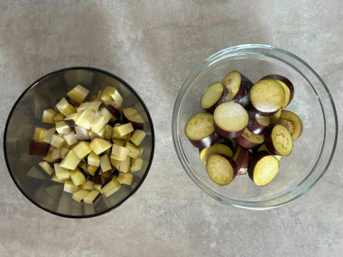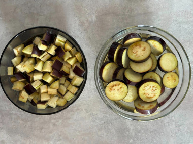 Если баклажаны необходимы для приготовления рагу, добавления в суп, то следует нарезать их кубиками.