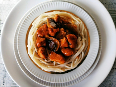 Гуляш с макаронами готовлю часто. Но никогда не пробовала добавлять в блюдо шампиньоны. Первый опыт приготовления такого гуляша удался на отлично! Ели его со спагетти. Получилось очень вкусно! Мясо хорошо пропарилось, стало мягким и сочным, пропиталось обволакивающим томатным соусом. Сочетание мяса и грибов по вкусу очень гармоничное. Соус, из-за которого я просто обожаю гуляш, получился густой, наваристый, плотный!