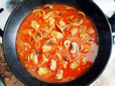 Готовила гуляш из мякоти свинины. Нарезала ее на кусочки, обваляла в муке и отправила обжариваться на сковородку. Как только мясо зарумянилось, добавила нарезанные шампиньоны, лук и чеснок. Жарила до мягкости лука. Затем залила содержимое сковороды горячим бульоном, добавила столовую ложку томатной пасты, соль, приправу для мяса, перемешала, закрыла сковородку крышкой и тушила до готовности. Болгарский перец не добавляла. Паприку заменила готовой приправой для мяса. Томатную пасту взяла вместо помидор в собственном соку. Кстати, думаю, что с ними было бы еще вкуснее. Стоит попробовать.