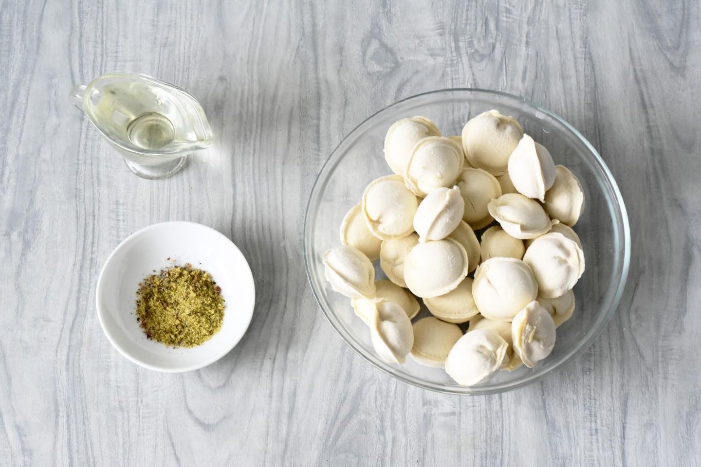 Подготовьте необходимые ингредиенты по списку. Пельмени предварительно не размораживайте. Специи можете взять те, которые вам больше нравятся, на ваш вкус.