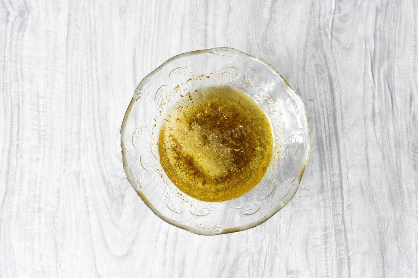 В мисочке соедините растительное масло и специи и перемешайте. У меня масло подсолнечное, но подойдет любое другое по вашему вкусу. Я использовала готовые специи для пельменей, но можете подобрать специи на свой вкус. Подробнее об этом читайте в статье по ссылке в конце рецепта.