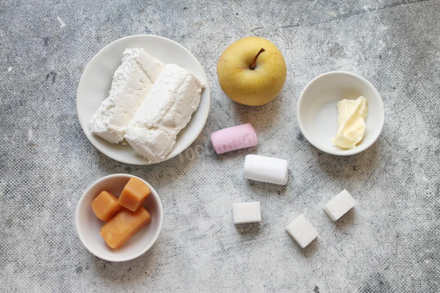Подготовьте все необходимые ингредиенты. Сливочное масло заранее достаньте из холодильника, чтобы оно стало мягким. Яблоко выбирайте кисло-сладких сортов, не очень сочных. Творог лучше всего взять пастообразный и не очень влажный, так как творог с зернышками может стать сухим и плотным.
