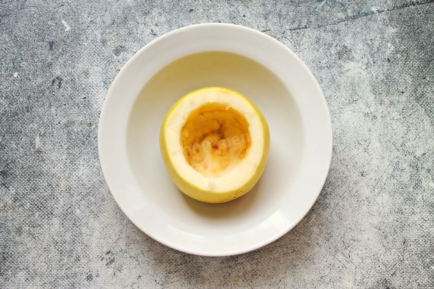 Яблоко вымойте, отрежьте верхушку и удалите сердцевину, оставив целым дно, а стенки толщиной примерно 0.7- 1 сантиметр. Слишком тонкие стенки пересохнут или развалятся, а толстые останутся жесткими внутри. А как сделать правильный выбор яблок - читайте в материале по ссылке ниже.