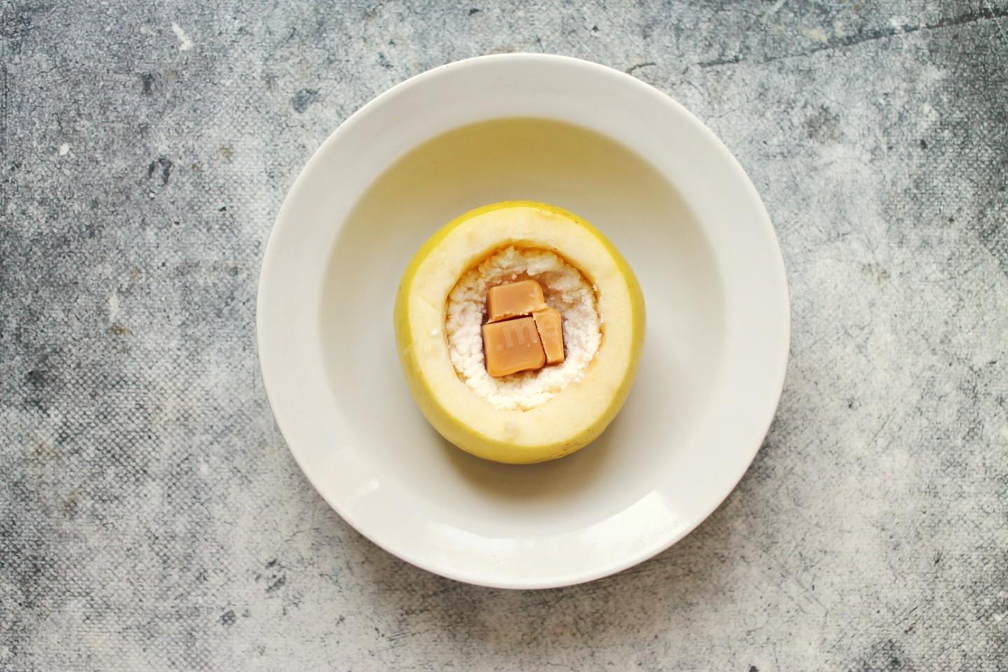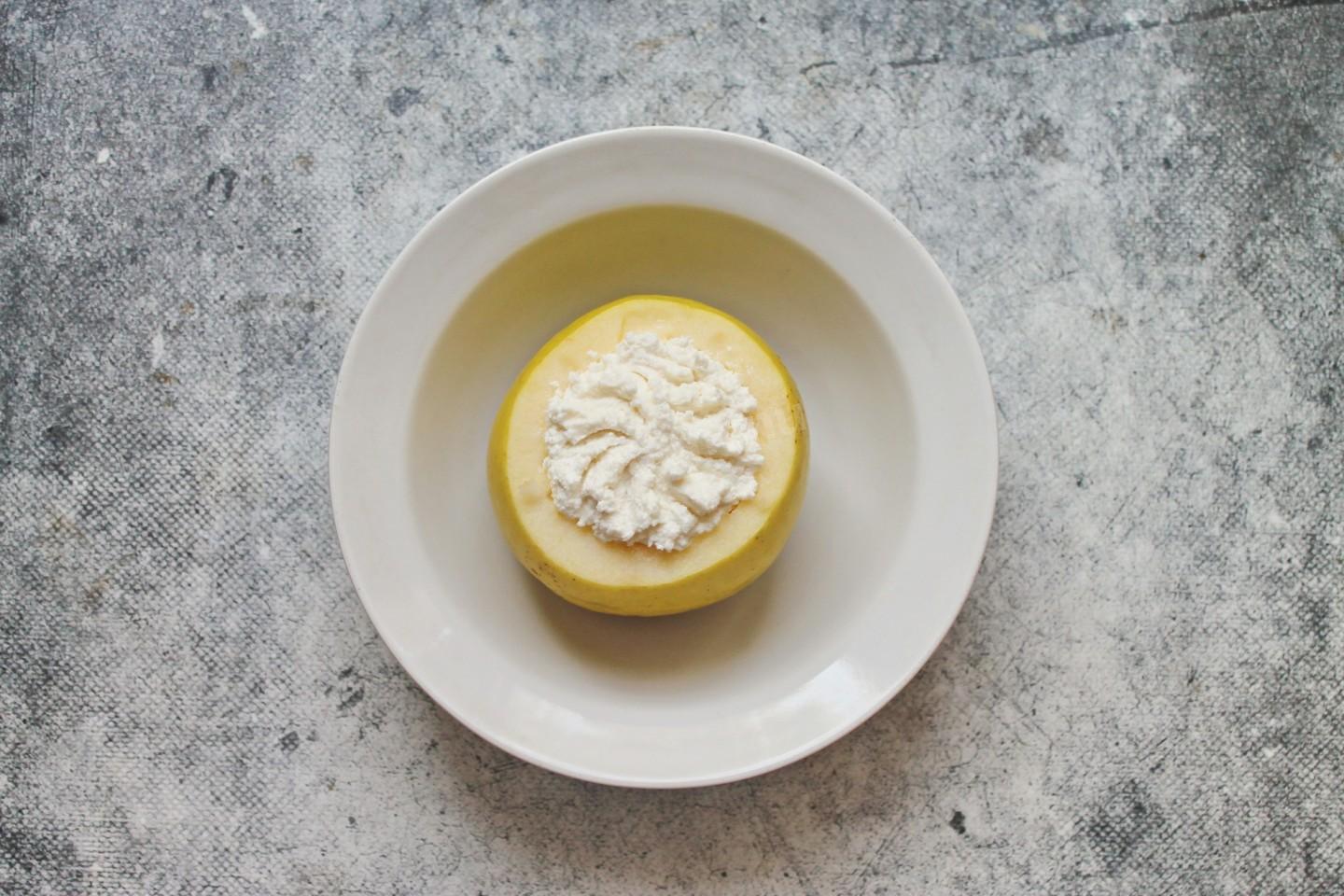 Поставьте яблоко срезом вверх в глубокую тарелку, которую можно использовать в микроволновке. Яблоко плотно заполните наполовину творожной массой и положите одну карамель. Подойдет любая молочная конфета, которая станет жидкой при нагревании, или просто густая карамель. Если добавите соленую карамель, это усилит игру вкуса. Сверху положите оставшийся творог и разровняйте.