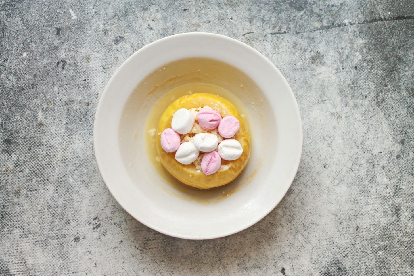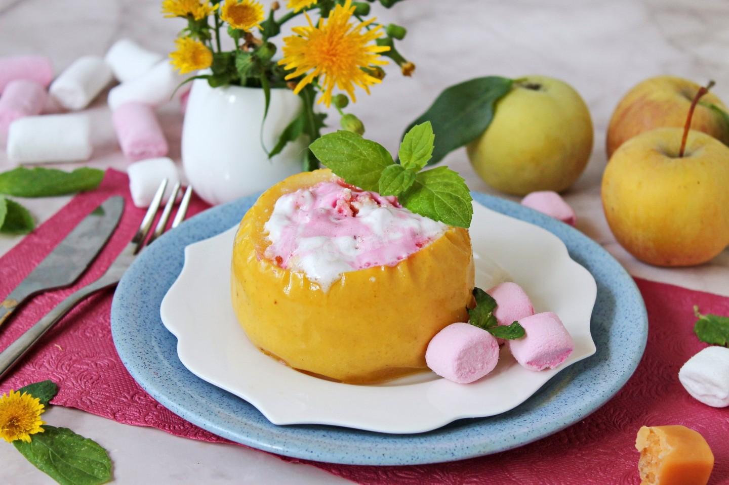 Когда яблоко дойдёт до готовности, выньте тарелку с яблоком, положите сверху маршмеллоу и верните в микроволновку примерно на 15-20 секунд, чтобы маршмеллоу растаяло.