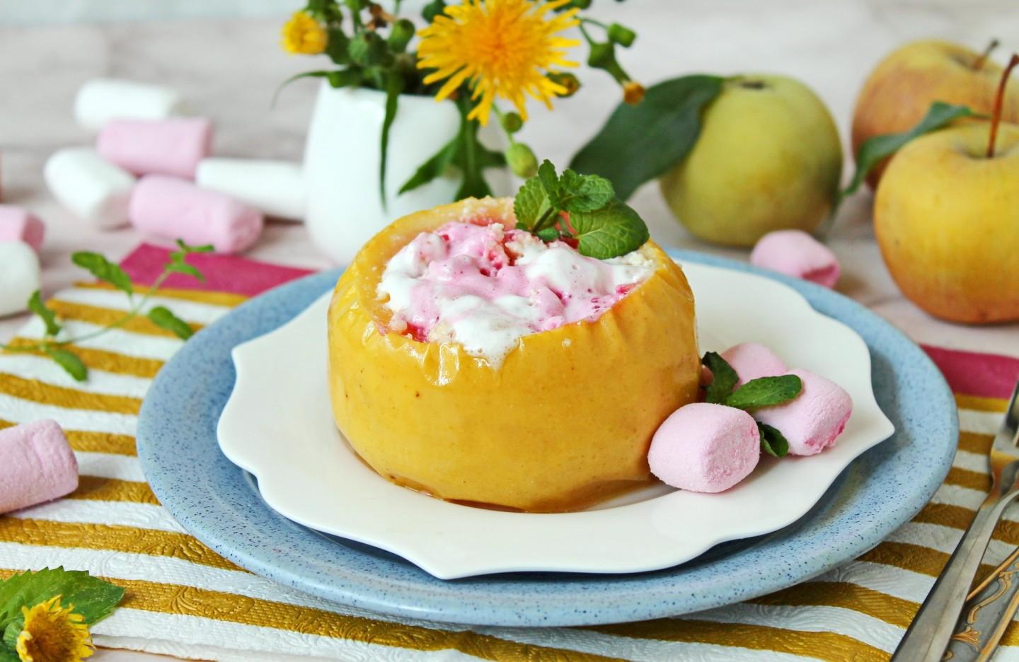 Готовые яблоки с творогом выньте, переложите на плоскую тарелку и сразу подавайте на стол, пока карамель и маршмеллоу остаются горячими и расплавленными. Приятного аппетита!