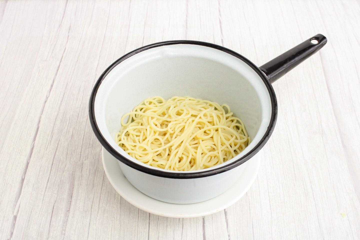 Спагетти опустите в кипящую подсоленную воду, перемешайте. Варите спагетти при умеренном кипении до состояния аль денте или следуйте рекомендации производителя, указанной на упаковке. Готовые спагетти откиньте на дуршлаг, чтобы стекла вода. В статье после описания шагов вы найдете советы, как подобрать кастрюлю для варки. Ссылка под рецептом.