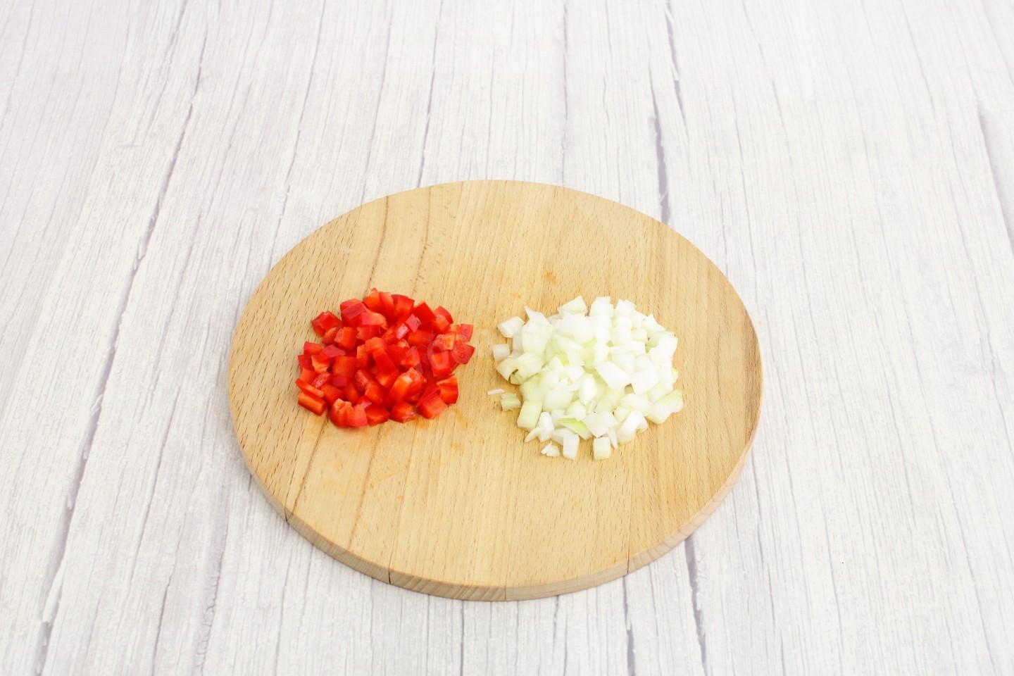 Овощи помойте. Репчатый лук очистите. Болгарский перец освободите от семян и плодоножки. Нарежьте овощи мелкими кубиками.
