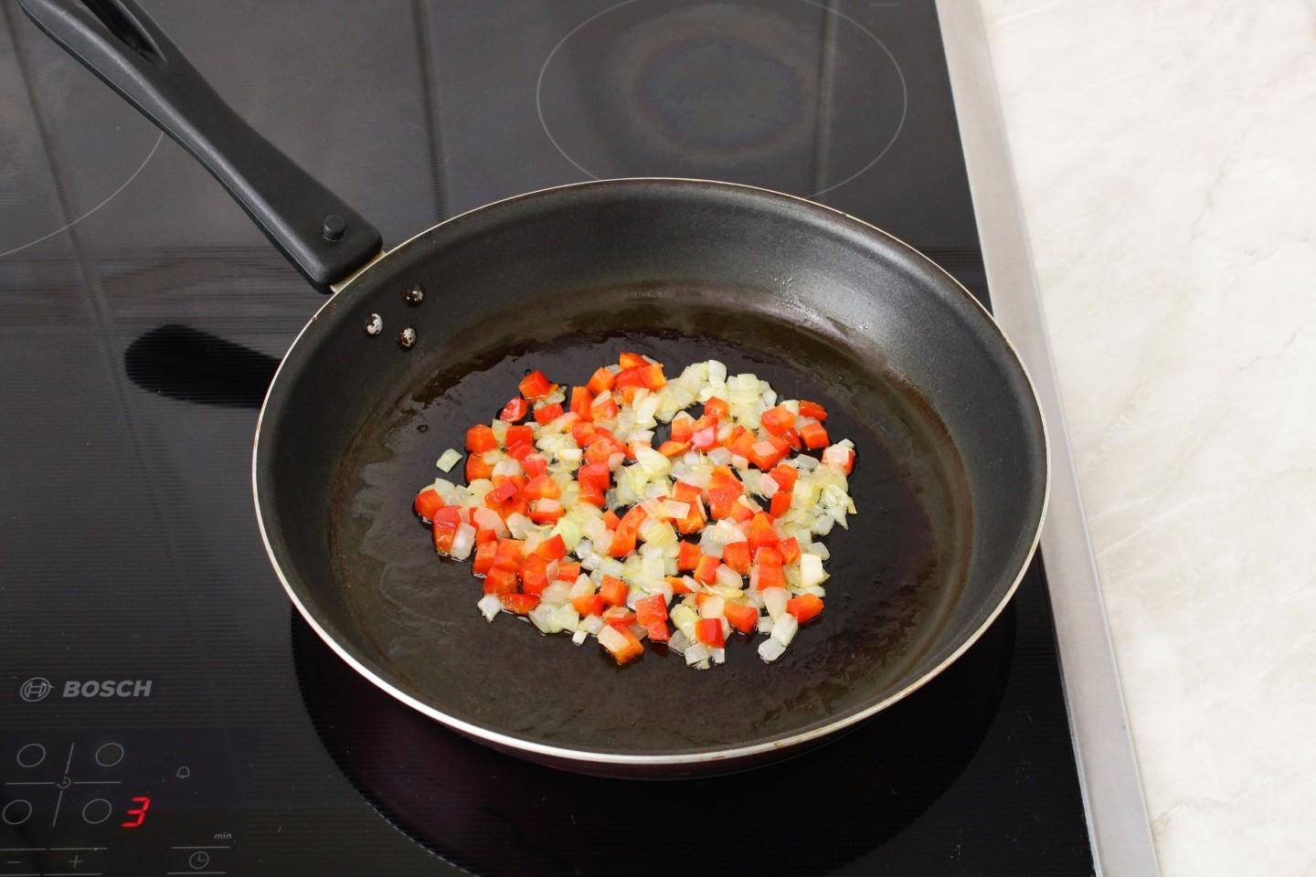 На сковороде разогрейте растительное масло и сливочное масло. На умеренном огне обжарьте репчатый лук, помешивая, до золотистого цвета. Выложите к луку болгарский перец, перемешайте. Обжарьте овощи до мягкости. Выбрать сковороду и масло для приготовления, а также определиться с температурой обжаривания помогут статьи по соответствующим ссылкам в конце рецепта.