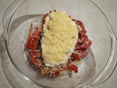 При приготовлении этого блюда ароматы стояли на весь дом! Очень ароматным вышло и готовое блюдо. Комбинация сливочный сыр - чеснок уже знакомо, а вот запечь курицу с двумя видами сыра и чесноком, да ещё на подушке из болгарского перца - идея нова и удачна (по крайней мере для меня). Получилось всё очень ароматно, сочно и вкусно!. Такая курица придётся по вкусу любителям диет.