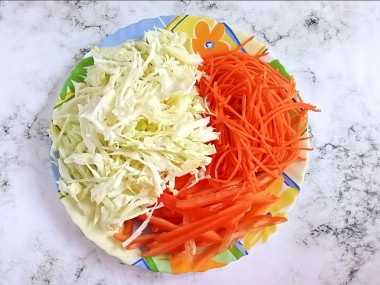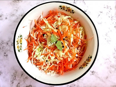 Делала его из молодой, сочной капусты, которую нарезала соломкой. Морковь натерла на терке для корейских салатов. Болгарский перец нарезала тонкой соломкой. Чеснок решила просто нарезать дольками и перемешала с овощами. Затем залила кипящим маринадом, перемешала и слегка утрамбовала в контейнере.