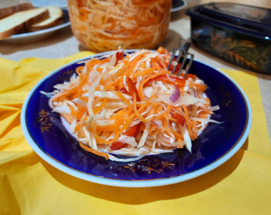 У нас в семье этот салатик мы готовим не первый раз. Очень вкусно получается! Сочный, ароматный, готовится быстро и просто. В салат добавляем ещё красный салатный лук. Очень вкусно))) Подкорректировали этот рецепт под себя. Количество уксуса берём процентов на 20 меньше, а воды, соответственно, больше. Кориандр не добавляем. Автору огромное спасибо за отличный рецепт. Рекомендую! Вот и салатик)))